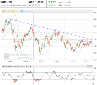 Er könnte seine Haltung wieder ändern, zumal der Abwärstrend aus 2008 ein deutliches Hindernis darstellt. Die 200-Tagelinie im Wochenchart könnte im Abwärtsgang den ersten Halt bieten.