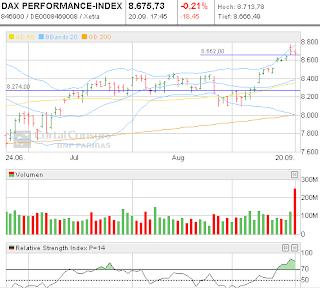 Beides zusammen könnte den Börsen etwas Wind aus den Segeln nehmen, so dass der zerklüftete Chart des Dax seine Löcher auffüllen könnte. Damit stünde möglicherweise ein erneuter Test der bewährten Marke bei 8.276 an.