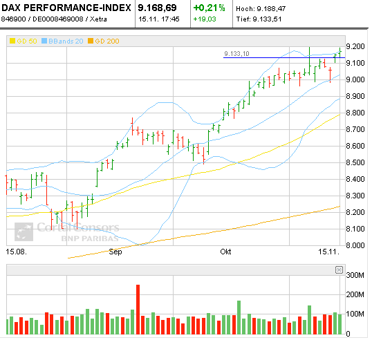 Fällt er zurück unter die Aufmerksamkeitslinie, die für Montag bei 9.133 notiert, könnte er damit eine Wende einleiten, die drei oder vier Tage Bestand haben könnte.