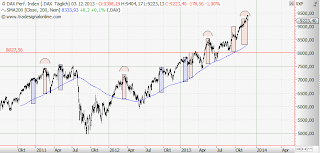 Selbst wenn von hieraus eine Gegenbewegung starten sollte, wird es vorläufig kaum zu neuen Allzeithochs kommen. Eher wird ein Test der 50-Tagelinie erfolgen. Dies kann ich dem Verhalten des Bollingerbandes zu entnehmen.