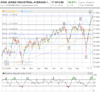 Diese klassische Konstruktion fehlt in den amerikanischen Indizes auch. Ein neues Allzeithoch, gefolgt vom nächsten, ist nach einem tieferen Tief nicht viel nütze; es sieht nur bedrohlich aus. Eine Sicherheit bekommen wir erst, wenn wir wissen, wo das nächste Tief zu finden sein würde.