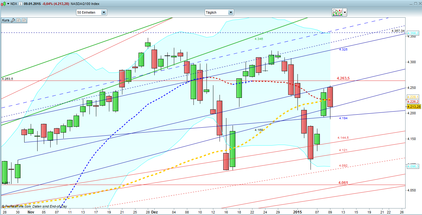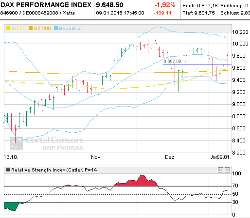 Das kleine Zwischenhoch am vergangenen Donnerstag erfüllte gerade mal die 5-Tage-Regel; es wurde auch in Amerika sogleich zum Wochenschluss wieder abverkauft – komplett – das spricht natürlich Bände und fordert die FED heraus, wegen rückläufiger Löhne und Gehälter, die Zinsen auch in 2015 nicht anzuheben. Ob das in diesem Vorwahljahr zu außerordentlichen Aktiengewinnen führen kann? Der sechste Tag im neuen Jahr jedenfalls hatte die schlechteste von drei hier vorgestellten Varianten, obzwar punktgenau, gehandelt. Die Berichtsaison mit den Unternehmensergebnissen des Jahres 2014 beginnt, traditionsgemäß mit Alcoa, am Montagabend nach Börsenschluss.