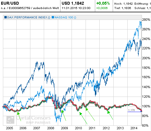 Ein wiedererstarkender Euro hatte in der Vergangenheit stets dazu geführt, dass Dax in seiner Performance mit Nasdaq konkurrieren konnte und den amerikanischen Schnellläufer häufig auch outperformte.
