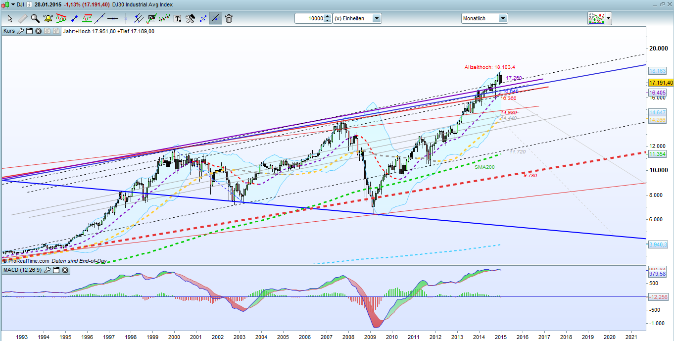 ‘Früher oder später’, so ähnlich lässt sich der Zinsentscheid der Fed zusammenfassen. Früher oder später wird es Zinserhöhungen geben. Press Release vom 28. Jan. 2015 Diese Nachricht übermittelte die Fed heute lediglich als Depesche, Frau Yellen kam nicht zu Wort. Zu klaren Maßnahmen kann sich die Fed nicht durchringen; die Börsen antworten darauf prompt.