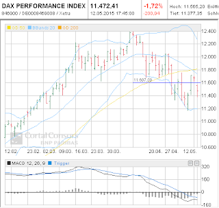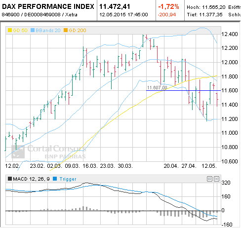 Dax müsste weitere 100 Punkte zurückerobern, um die 20-Tagelinie zu erreichen, dann wäre er knapp unterhalb der 11.712er Barriere angekommen.