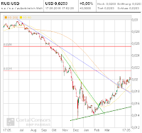 Russland hat alle Sanktionen gut überstanden. Der Rubel wird sich, über kurz oder lang, weiter erholen. Der Chart setzt seinen Gang regelkonform fort, da besteht kaum ein Zweifel.
