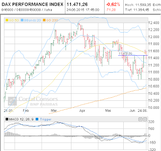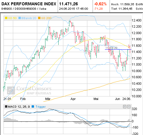 Scheitert Dax an der Aufmerksamkeitslinie oder am Kreuzwiderstand – oder fällt er unter diese Marken zurück – wird Angst vorherrschen, so dass die wichtige Barriere bei 11.455 vielleicht auch heute nicht stützt. 11.420 hatte ihm gestern im Handelsverlauf gut gefallen, vielleicht setzt er heute darauf, dort abzuwarten, ob neue Ideen aus Athen den azurblauen Himmel für die Europäische Gemeinschaft – und für den Besuch der Queen – strahlen lassen. Fällt Dax tiefer, wird voraussichtlich auch die 11.394 und 11.374 nicht halten, so dass Dax einen Schlusskurs unterhalb der 20-Tagelinie , die bei 11.256 heute verlaufen könnte, bevorzugen wird. Die schöne 11.319er/11.308er Barriere und die 11.274er Grenze wären dann ebenfalls zerschlagen und er müsste seinen Joker an der roten Gap-Linie bei 11.136 setzen, um morgen nicht mutlos die Handelswoche zu verlassen.