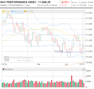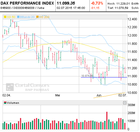 Für Europa wird das griechische Referendum ins Gewicht fallen, so dass die letzten Vorkehrungen für den Montag, sofern noch nicht geschehen, getroffen werden könnten. Große Bewegungen hatte es aber schon heute nicht mehr gegeben. Von Interesse war sowohl die 20-Tagelinie als auch die rote Gap-Linie, die morgen bei 11.178 verläuft. Dax musste beide aufgeben und neigt zu Schwäche, wie man auch erwarten durfte.