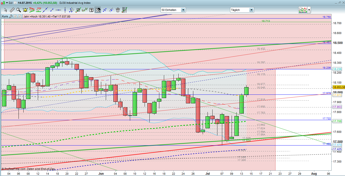 Für eine Fortsetzung des steilen Trends sprechen in meinen Augen  die amerikanischen Indizes, bei denen sich nun langsam die Möglichkeit neuer Höchststände konkretisiert. Ein weiterer positiver Tag könnte folgen. Einen Grund dafür könnten die schwächeren Wirtschaftserwartungen hergeben, die eventuell eine Erhöhung des Zinssatzes hinausschieben werden.
