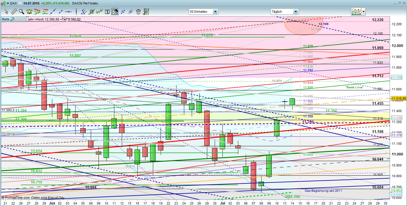 Herr Tsipras wird es schwer haben, seine Vereinbarungen mit den Geldgebern im eigenen Lande durchzusetzen. Das alles muss aber nicht stören, wenn ein Handelsplan durchgeführt werden soll. Vielleicht bleibt daher der Kursbereich um 11.750 – so wie es sich aus der Umkehr des Dax an der Gap-Begrenzung aus 2011 herleiten lässt – das Ziel der Bewegung werden.