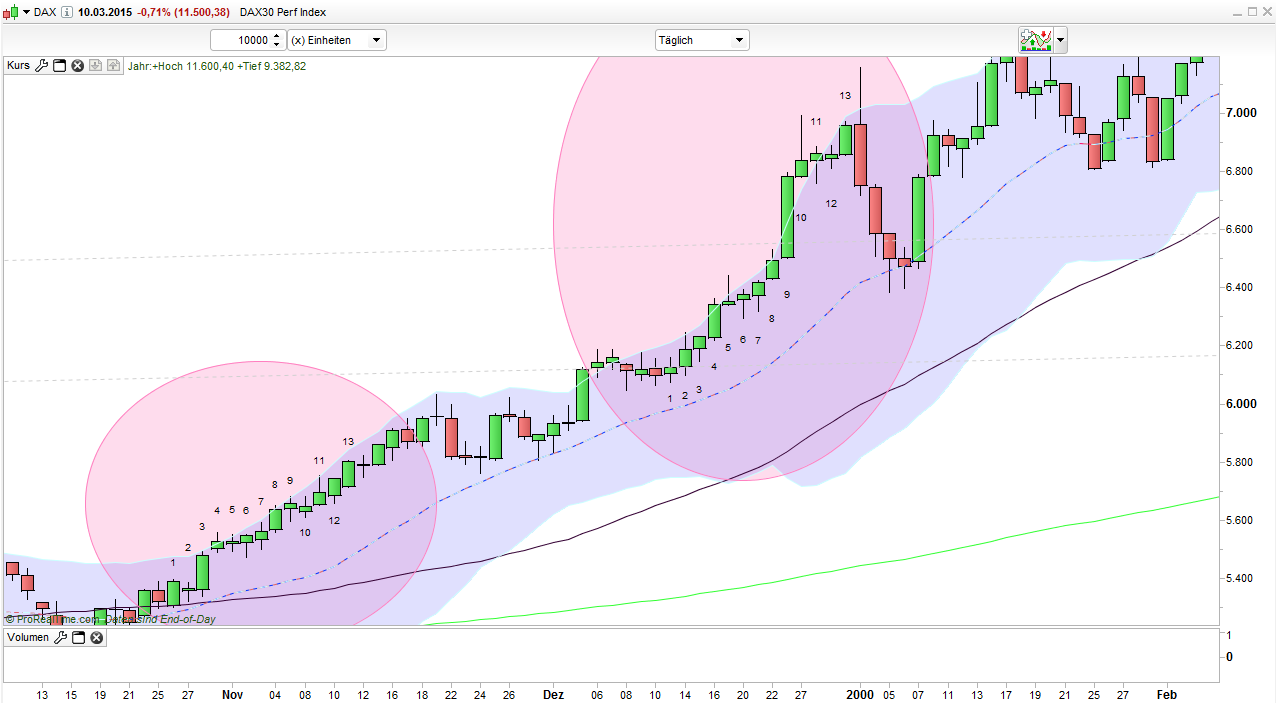 Man sieht im Herbst 1999 sehr deutlich, dass Dax die Abfolge positiver Tageskerzen sehr weit ausdehnen kann. Die maximale Anzahl grüner Tageskerzen ist dort zu finden. (Ähnlich hohe Werte findet man im Jahr 2006/2007.)